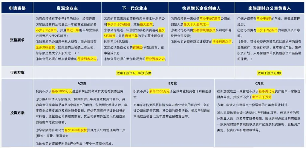 | 选项A:创业或扩展现有业务 | 在新加坡成立一家新企业或扩展现有业务,投资额至少为1000万新币。需提交详细的5年商业计划,且公司需属于指定行业。 |